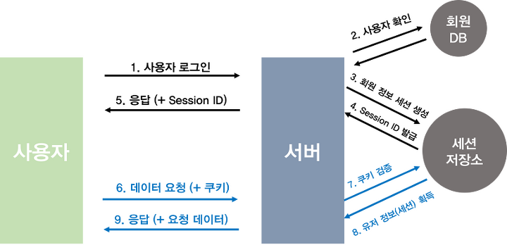 위의 그림에서 보면 알 수 있지만, 세션저장소는 서버쪽에 있다.